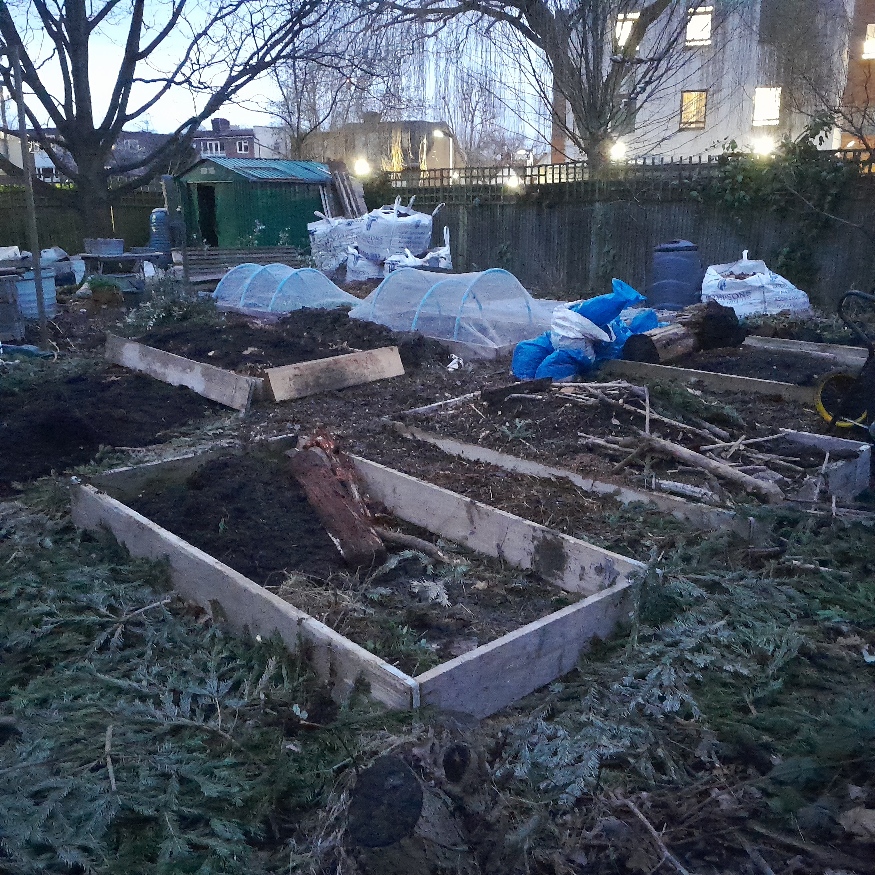 The old grow beds are being replaced with new semi-raised planters, made from sturdy reclaimed scaffold boards. The layout chosen for these beds was made through a meticulous planning process, including our members and consultations with our NHS friends at the health centre. Staff and site users, have really enjoyed visiting the site and we are so excited to be involved with such inspiring groups and charities through the Haringey Circle group and the Health Centre community cafe, amongst others. The grow space maximizes sunlight exposure in a corner while minimizing tree shade. Paths have been designed to facilitate easy access to the polytunnel and tool shed, creating a seamless flow around the beds and grouping the beds to maintain an inclusive, welcoming social space to grow together.