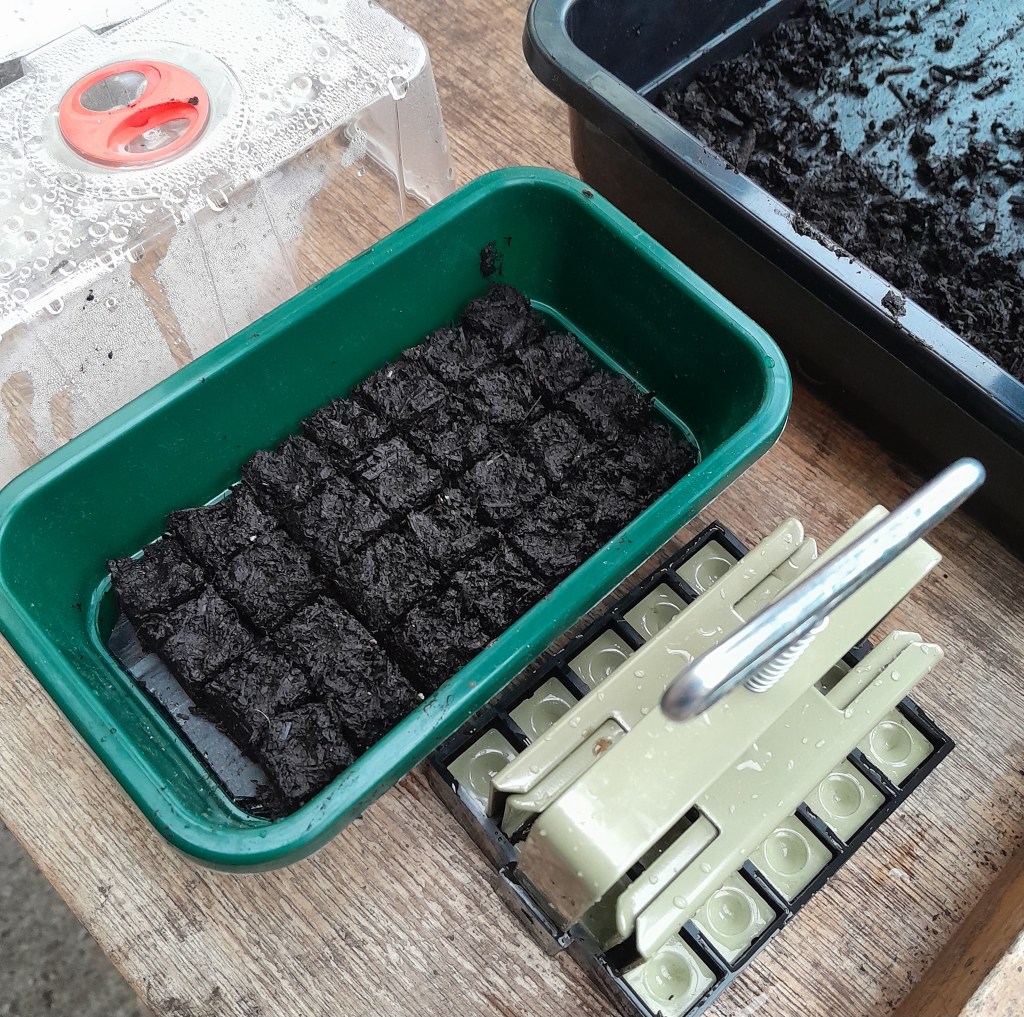 We are trying micro soil blockers for sowing our seeds this year. A soil blocker creates a little compact block of seed compost which thanks to the soil blocker holds itself together into a little cube! The soil blocker also leaves a handy little divot on top in which to place the seed.
