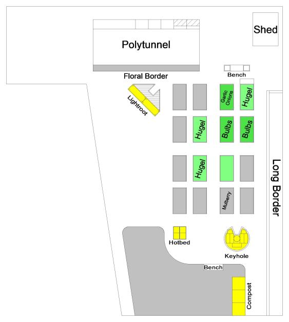 In addition to the raised beds we have plans for a Lightroot bed, a cone bed or keyhole bed, hotbeds, nursery planting area, straw-bale beds and herb spirals, to be included at a later date.