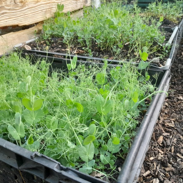 Since the peas are already growing, it seems a waste to then compost them straight away, so we simply keep them growing on in trays and then use the growth as a green manure. Green manure is a crop grown purely to be incorporated into the soil as a fertiliser, whilst it is still green, it doesn’t need to be broken down into compost first.
