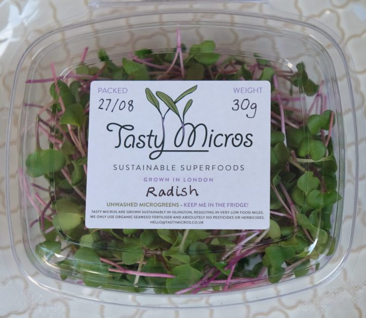 These are micro greens, delicious and nutritious microgreens, grown sustainably in London by tastymicros. Nutrient rich and fast growing, microgreens can be grown in very small urban farms, stacked vertically on shelves, or even at home on your window sill. The shoots are harvested for use in salads etc. Once the young shoots are harvested the plants get a bit tough so that’s where we come in and compost them! TastyMicros deliver the finished growing medium and seed to us every few weeks.