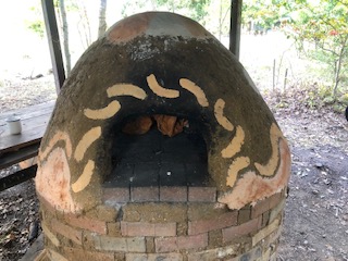 The MOP oven was built on site around 2012 and is still going strong today. As you know it lives under a roof to keep it dry from the rain and stands on a raised brick plinth to keep it dry down below. Made of subsoil rich in clay dug out here on site add in some sand and straw and you have the old building material called cob – mixed here by many volunteers hands and feet and built up by hand around a giant sand dome form. When its dry enough you cut your door hole into the cob drag out the sand and hey presto you got a big old oven to cook with. Simple ideas really are the best!
