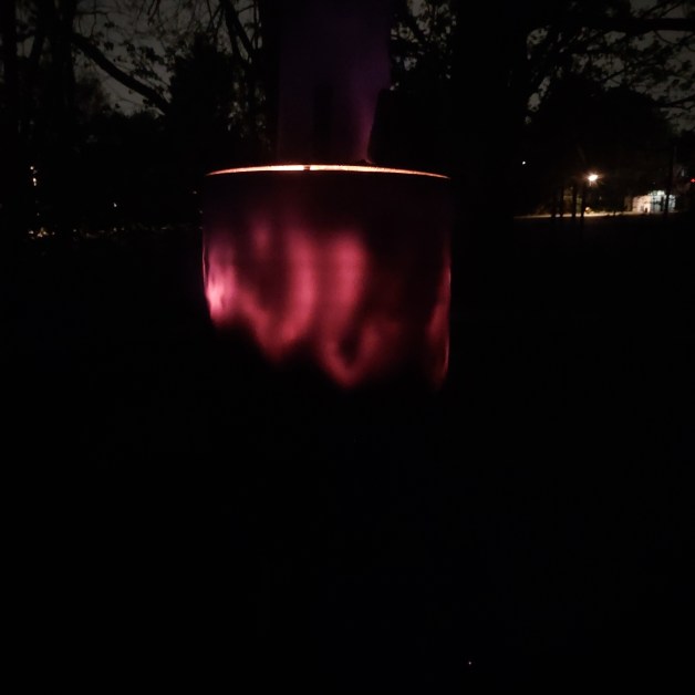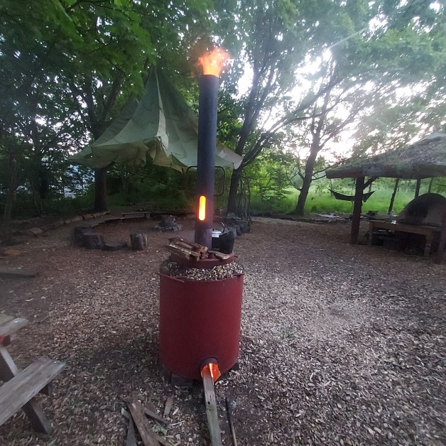 The retort, once loaded is lit from the top and the fire spreads downwards, charring the feedstock in the inner drum. A small gap around the lid of the inverted inner drum allows the wood gas to exit, where it then ignites inside the outer drum, further heating the inner drum. Since the wood gasses are burnt inside the burn chamber and inside the flue, these methods produce far less smoke than an open fire for example. Once up to temperature in retort mode the resulting exhaust from the flue should be clear, with just a heat-have and red jetting flame from the retort.