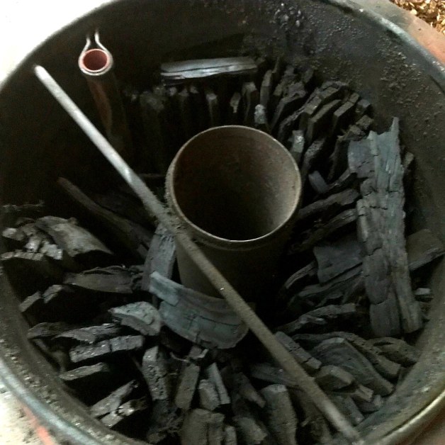 A small pipe inside the retort funnels the resulting wood gasses back down into the burn chamber, these wood-gasses then ignite in the burn chamber which helps to sustain the burn, once heated to around 450 degrees the timber inside will begin to char and off-gas these flammable compounds. As the burn advances and the wood inside becomes char, which is largely purely carbon, there will be less smoke or woodgas to fuel the burn and the fire will die down. At this point the retort can be capped off, allowed to cool and then emptied.