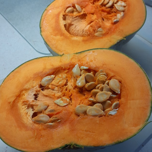 Cut the pumpkin in half, scoop out the seeds, place to one side and then cut the halves into halves.