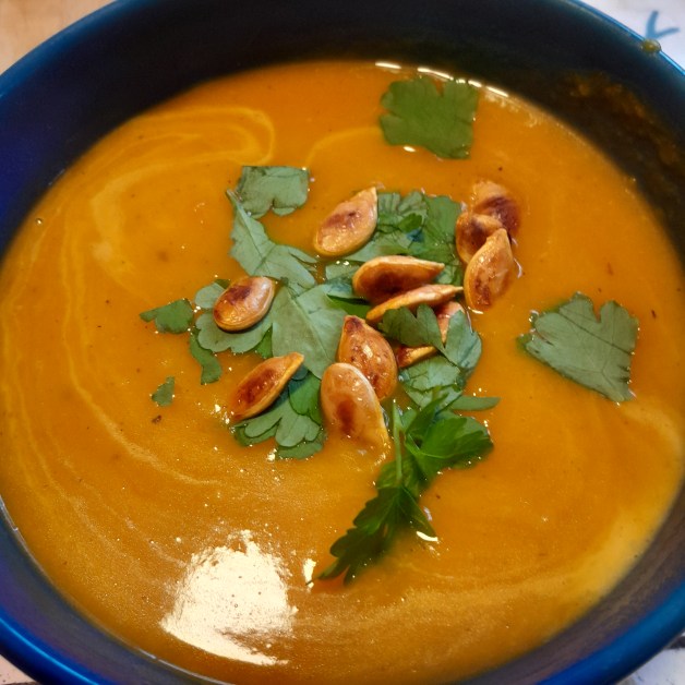 Serve the soup with a stir of cream, coconut cream, garnish with pan fried pumpkin seeds and torn parsley.