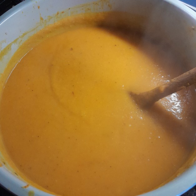 When the pumpkin is tender, remove from the oven and add the vegetables to 1.5 Litres of vegetable stock in a large pan.