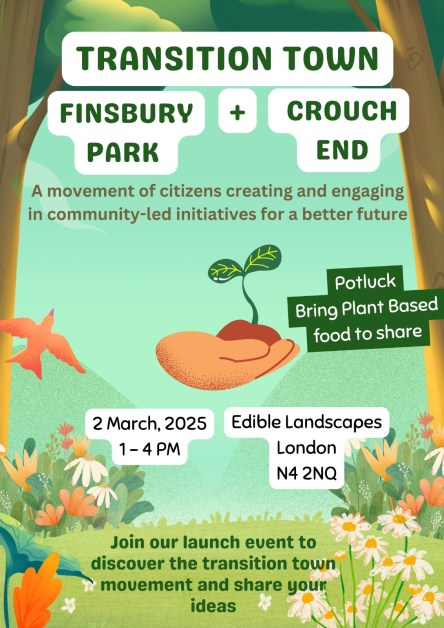 Our volunteers, along with our friends at Edible Landscapes London and Wolves Lane are helping to relaunch Transition Town Crouch End and Finsbury Park! Come along this Sunday to find out more. Bring some (plant-based) food, hear an intro, and chat about what we want to build together!