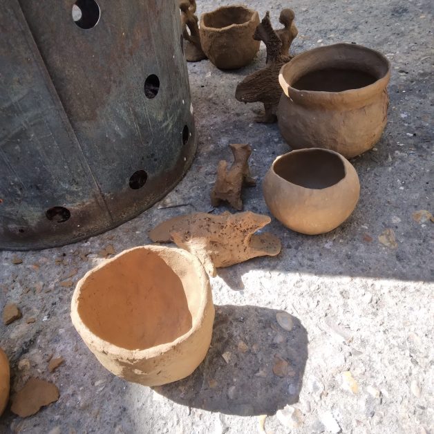 Adding even a small quantity of the grog to the clay makes the material immediately firmer and stiffer, rather less workable and it dries out a little quicker in your hand as you model it. The exact ratio of grog varies, depending on what the intended outcome is. For our wood firing we are really going for the primitive side of ceramics, no electricity or potters wheels, making by hand and really gaining insight in what our ancestors did, thousands of years ago.