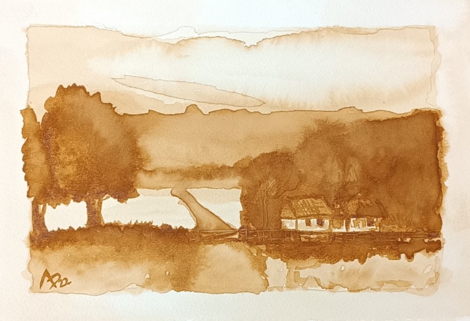 Using coffee adds depth and softness, as if the warmth of memory has soaked into the paper. More than just a landscape, this is a portrait of memory, preserved in earthy tones.