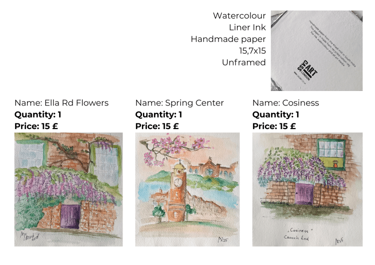 I am inspired by the effect of changing light and weather conditions in our local area, as well as British areas of Outstanding Natural Beauty and overseas. I sell my originals, prints and greeting cards throughout North London through galleries, shops, craft-fairs and my studio-based Art sales.
