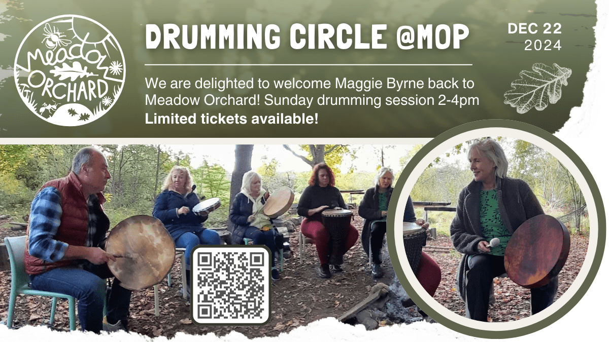 Drumming Circle for the Winter SolsticeSadly Novembers Drum Circle was cancelled due to Storm Bert, but thankfully Maggie returns to Meadow Orchard on the 22nd of December to celebrate the Winter Solstice with her lovely community drum session! The beautiful Roundhouse is available for the session if it’s a little too cold to drum outside.Continue reading “Drum Circle 22/12/24”